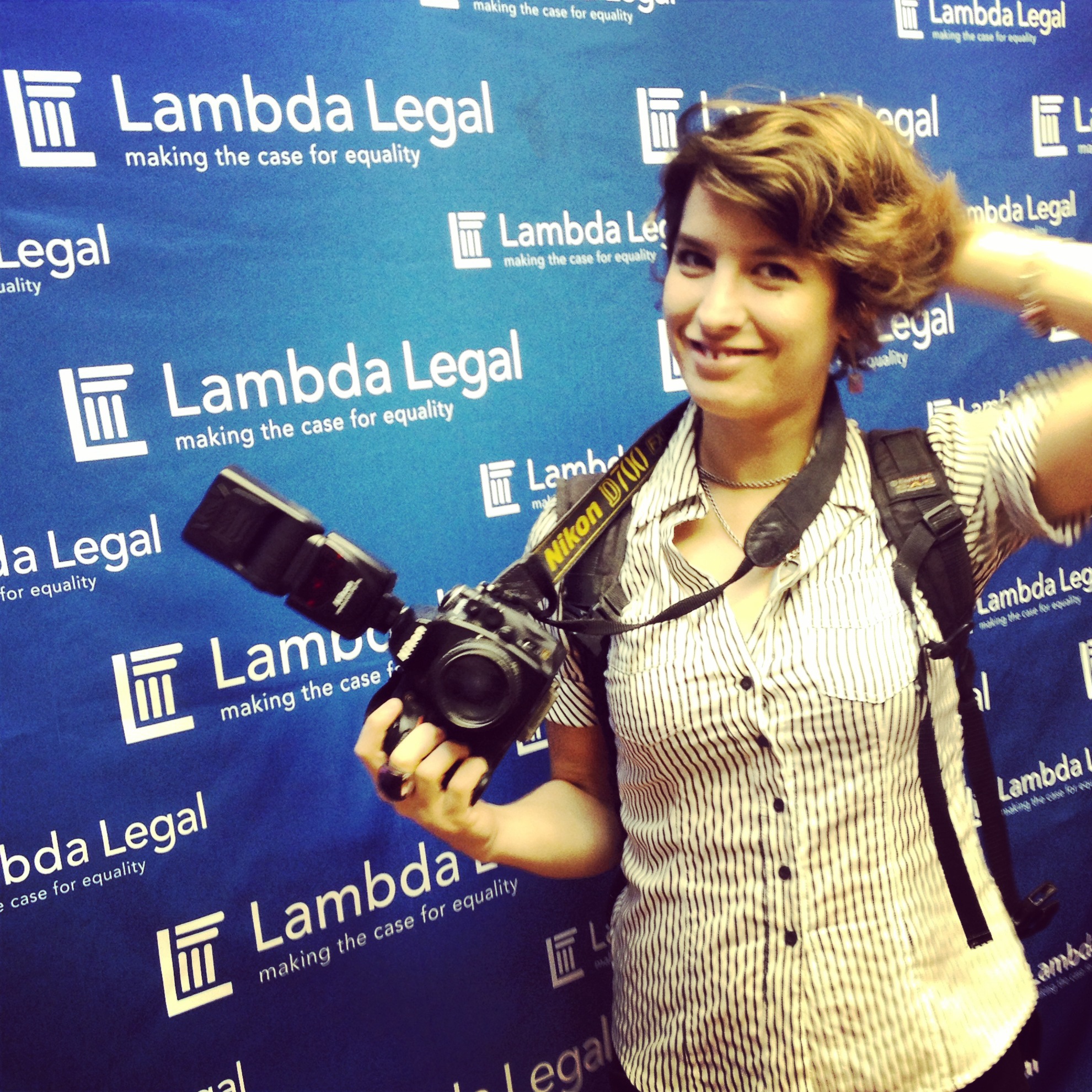 Thats me! Frances Davis the principal photographer for Rincon Images, standing in front of the Lambda Legal back drop. Same sex wedding photographer Puerto Rico.