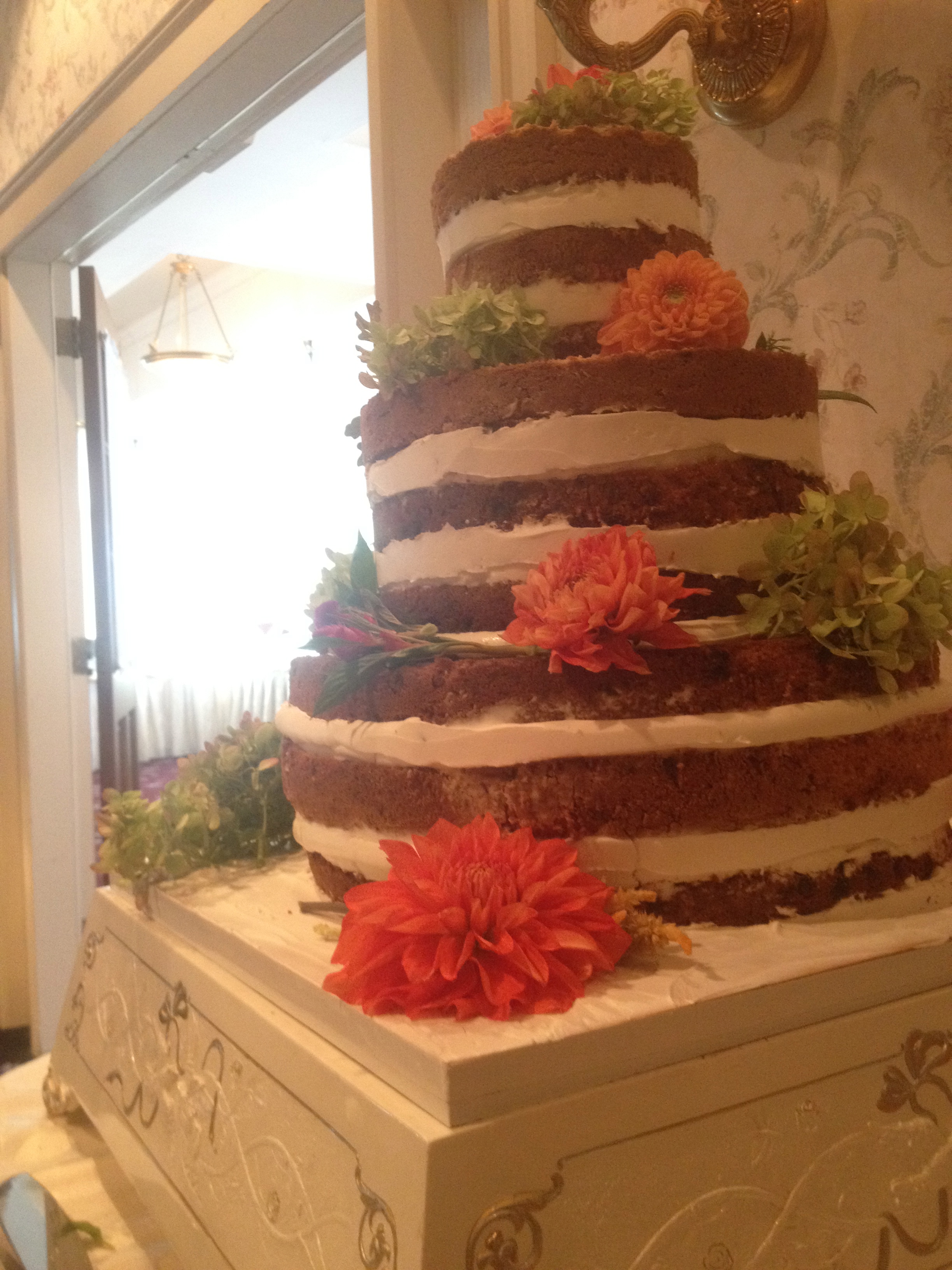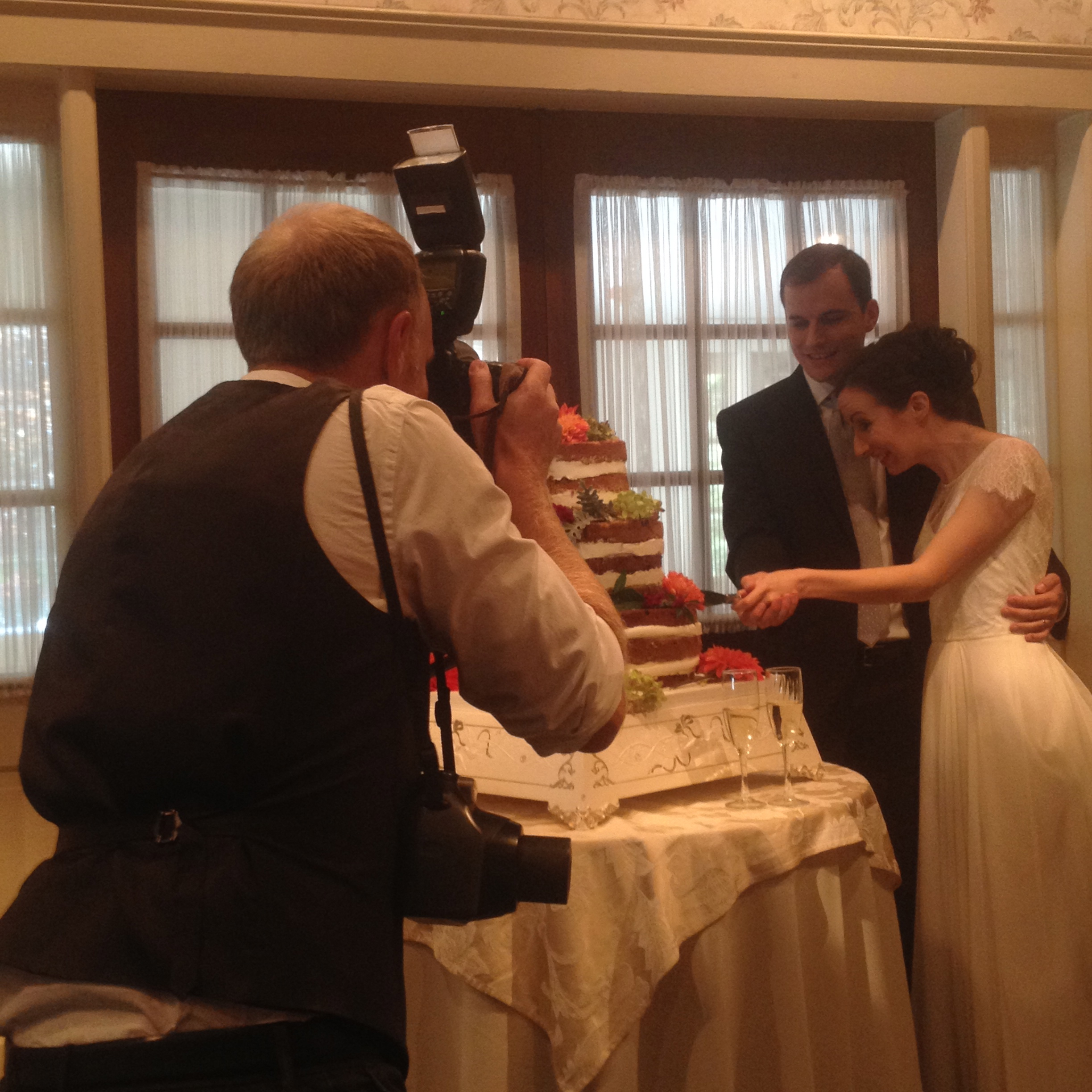 naked wedding cake with flower decorationswedding groomsmenWedding photographer Chris Jordan snaps a photograph of my brother and his new wife cutting the cake